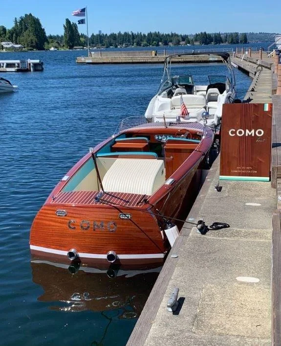 Bruce went to work finding an appropriate boat to meet their needs for the venture. Como, the restaurant, is located next to the luxurious Wood Mark Hotel at Carillon Point on Lake Washington. Their initial choice was to acquire a Riva. The boat had to have an Italian flair, have an open cockpit to seat a minimum of six guests and allow them to serve wine/appies on route to the restaurant. This venture also had to be accomplished within a certain tight budget. In researching Riva’s they come in a variety of formats. The Junior, Olympic and Florida are meant for use as a launch or tender. The Aristan, Tritone and the Aquarama are Cockpit runabouts. Although a Riva would have been a suitable match for the Italian restaurant their budget and availability meant we couldn’t make a Riva work for them.