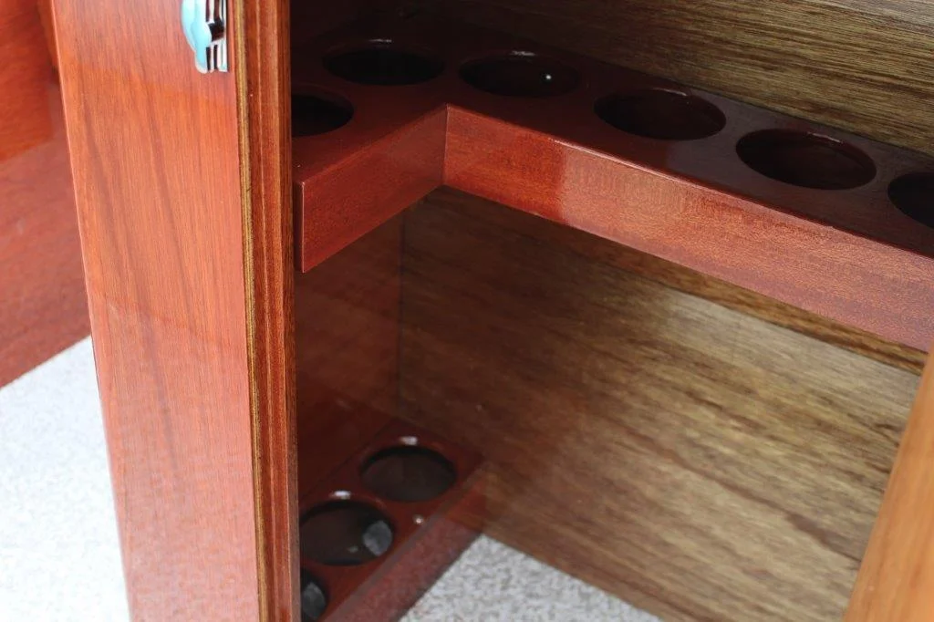 Once the hull was completed we then set out a plan for the interior, using “Riva” styling accents. Aqua or Coral with Ivory vinyl was often used on Riva’s. We chose Aqua to match the turquoise in Como’s branding. Cabinets were installed behind the front seats and we added an additional 3/4 bench seat in front of the engine box to allow increased seating capacity. We installed a modern cable/ram steering system and tilt wheel, new gauges, windshield and interior lighting. The boat is powered with a modern V8 with a Velvet Drive gear box which pushed the boat to speeds over 40mph.
