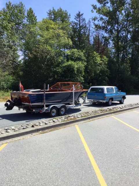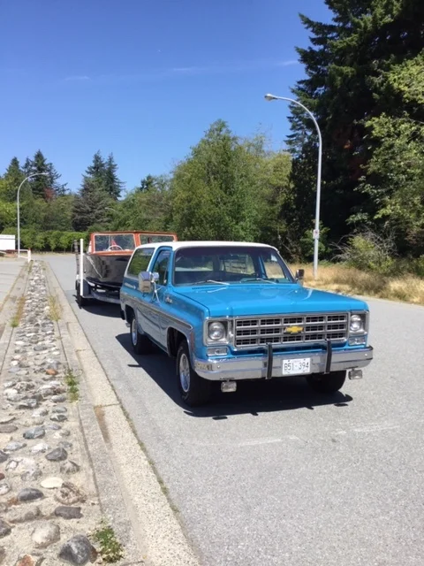 When Marty and I were at the Burrard Yacht Club Show, we were visited by Leagh and Lynn Gerlays. Leagh told us of how he owns a cool vintage Blazer! He said he had not moved it out of the garage in a long time. Our trucks towing the boats must have inspired him to get it out and tow his boat because he sent these photos a short time later! Thanks Leagh!